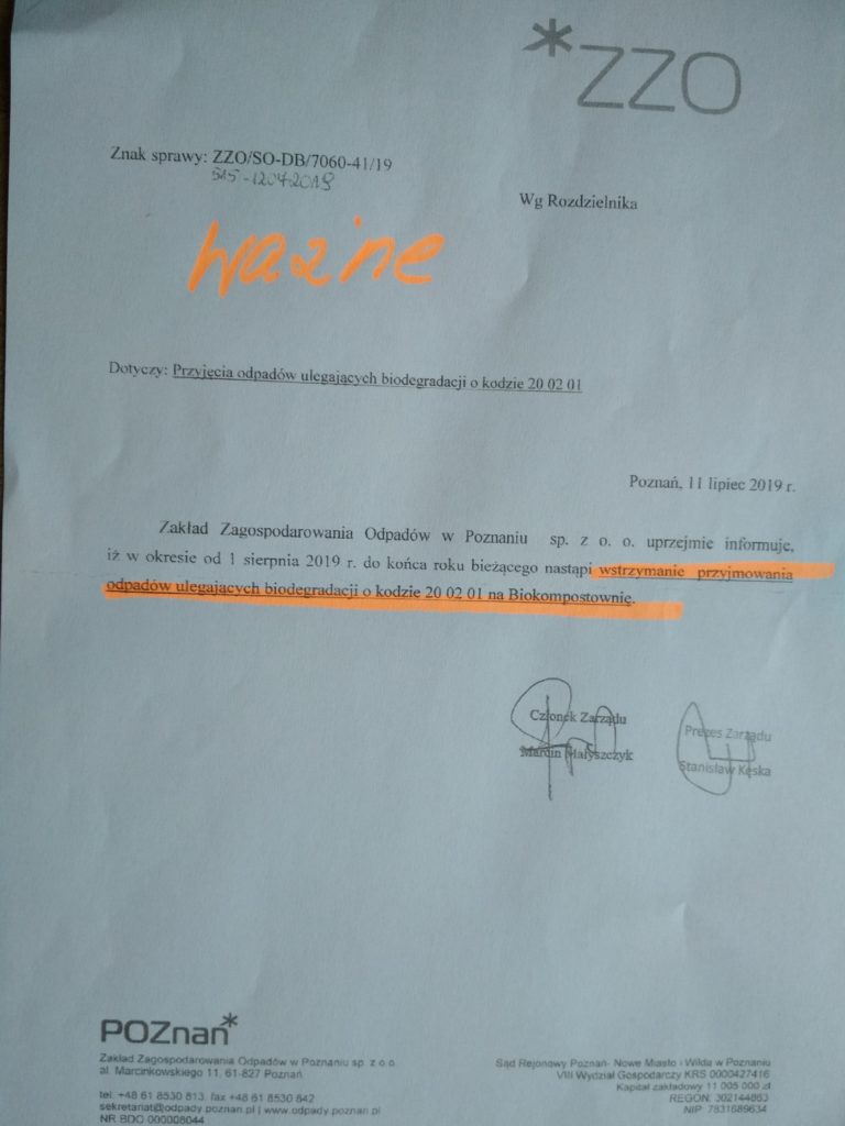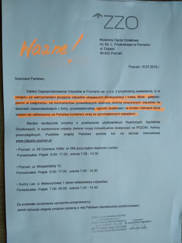 Zakład Zagospodarowania Odpadów w Poznaniu zawiadomił nas o tym, że z dniem 01. sierpnia 2019 r. zaprzestaje wywożenia odpadów „zielonych” z naszego ogrodu. Każdy z Działkowców może samodzielnie dostarczać odpady zielone do punktów odbioru, adresy poniżej w piśmie ZZO. Jednakże najlepiej byłoby, aby Użytkownicy działek wszelkie odpady zielone kompostowali na terenie swojej działki. Przypominamy, że zgodnie z Regulaminem ROD, na każdej działce musi być kompostownik.